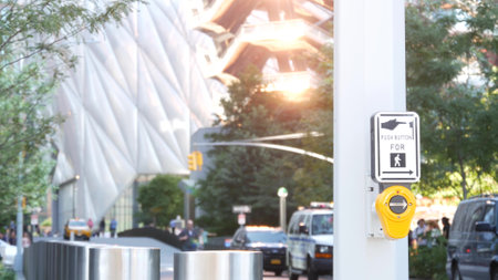 New York City, United States - 1 Sept 2023: Hudson Yards architecture in Chelsea, Manhattan Midtown Vessel, NYC, USA. Defocused people, urban road traffic, 34 street. Crossroad traffic light button.