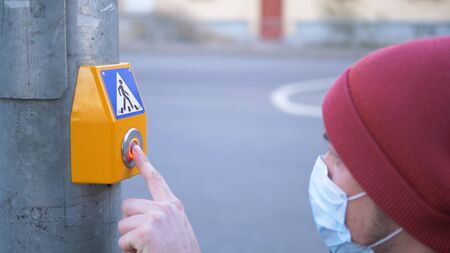 protection against coronavirus on street, young man in medical mask and rubber gloves disinfects pedestrian crossing button at traffic light with antiseptic and presses it close-up