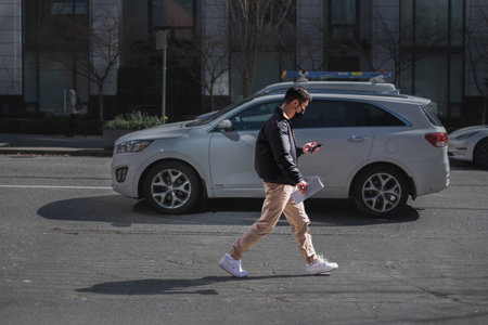 Photo of young asian business man using smart phone in the city street. Young man wearing mask and walking on street using mobile phone. Street photo, editorial-Vancouver Canada-March 22,2023