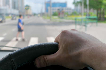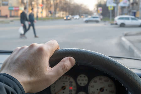 view from the car, the man's hand on the steering wheel of the car