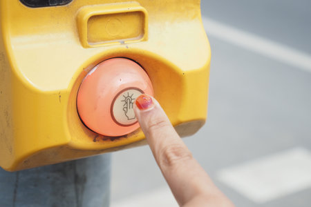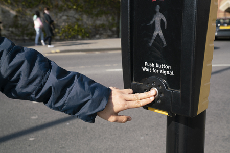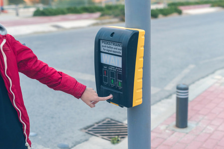 Female hand pressing a button at traffic lights on a pedestrian crossing.