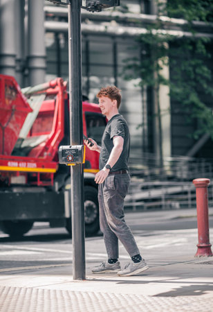 London, UK - June 21, 2022: Young man, contractor waiting to cross the road in the City of London, street photography