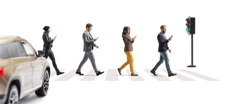 People crossing street at a pedestrian crossing and using mobile phones and a car waiting isolated on white background