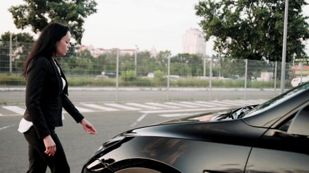 Upset lady standing near a broken-down car outdoors. Car service, transport, trip concept . Car breakdown on road.