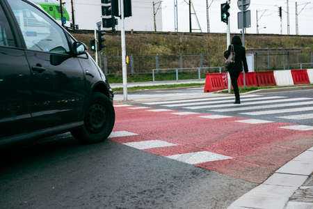 A black SUV partially crosses a vibrant red and white crosswalk in a city setting. The focus emphasizes texture and urban intersection elements. Depth-of-field effects create visual interest.