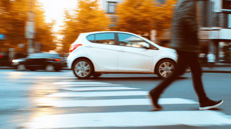 White car passing fast on a crosswalk while a pedestrian is walking on it, creating a motion blur effect that conveys speed and potential danger in urban traffic