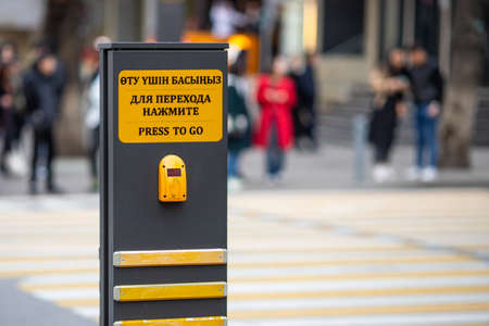Button for turning on the green light of a traffic light at a pedestrian crossing. Almaty, Kazakhstan - March 21, 2021