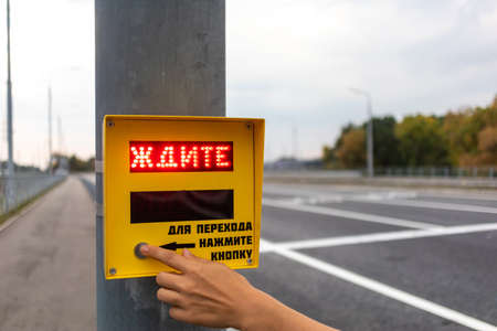 Human hand presses the button of the pedestrian crossing with the red inscription Wait.