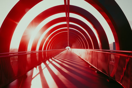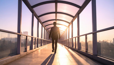 An elevated walkway with a glass and metal structure is depicted from a perspective view. The composition features linear elements, natural sunlight, and geometric forms. Suitable for illustrating architectural design concepts, urban planning, or conveying a sense of progression. It could be used in editorial pieces or for commercial purposes.