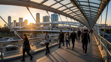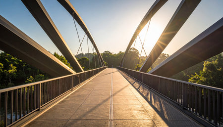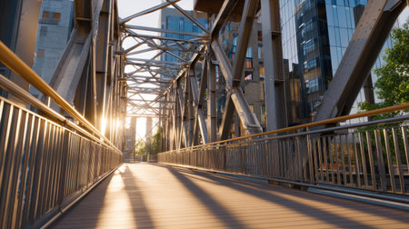 A beautiful morning view of a modern metal bridge bathed in sunlight, surrounded by sleek urban buildings. This serene scene captures the essence of city life.