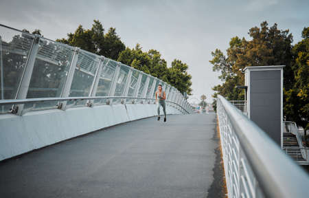 Young mixed race female athlete looking serious while wearing headphones listening to music and sprinting on a bridge outside in the city. Stay determined and focused to reach your fitness goals