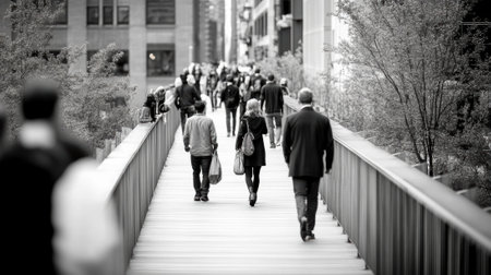 A group of people walking down a bridge with bags, AI