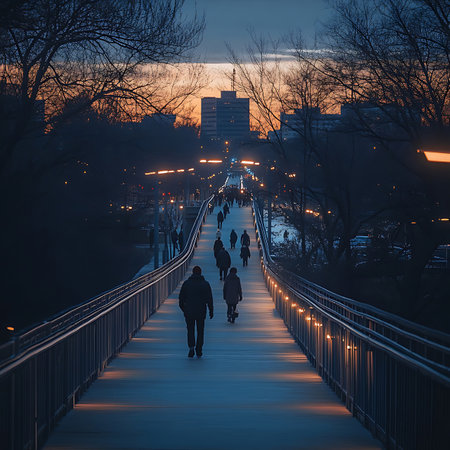 A serene urban scene capturing silhouettes of people walking on a brightly lit bridge during twilight, surrounded by trees and a peaceful city atmosphere.