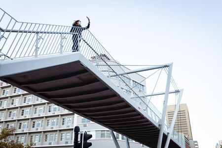 Silhouette man walking on Te Rewa Rewa bridge, Bridge under maintenance, New Plymouth