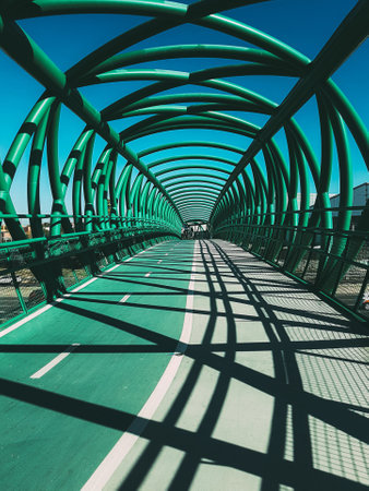A vertical shot of a modern metal bridge in the blue sky background
