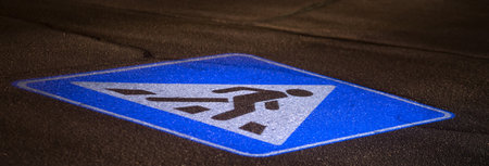 Vibrant blue, white, and yellow pedestrian crossing sign stands out on street background. Ai Generated