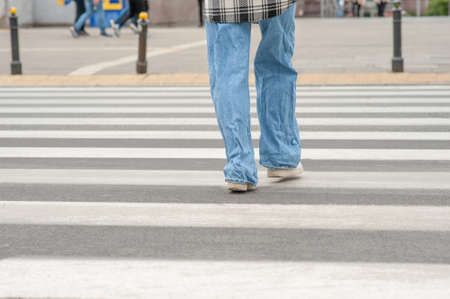 Legs of people in sneakers and jeans crossing pedestrian crossing. High quality photo