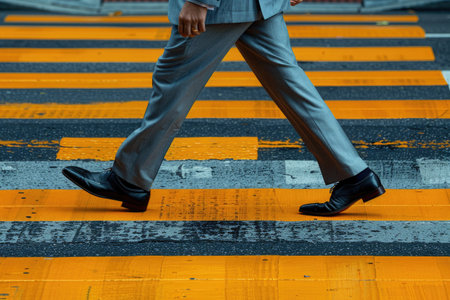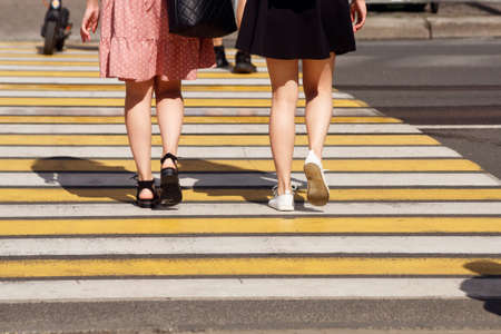 Unrecognizable legs of people crossing a yellow zebra or urban pedestrian crossing. Waist down view of people, legs and feet on asphalt crossing, sunny summer day