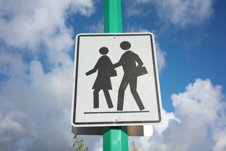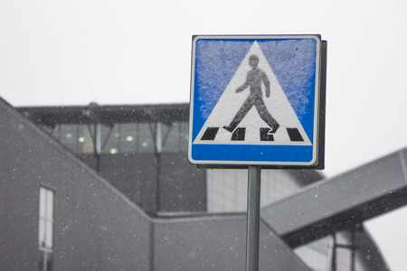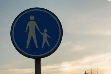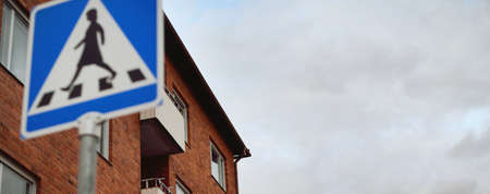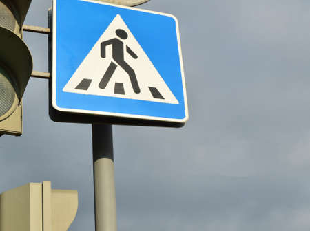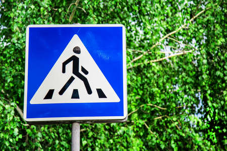 The square blue and white sign pedestrian crossing, the concept of road safety.