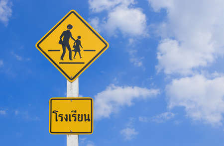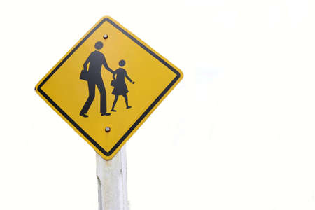 Traffic yellow road sign warning school zone ahead isolated on white background closeup..