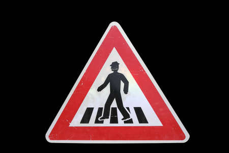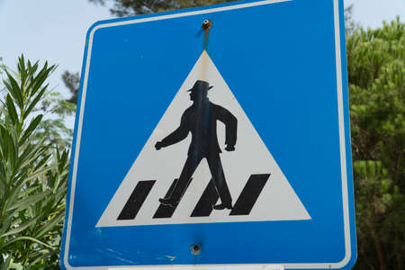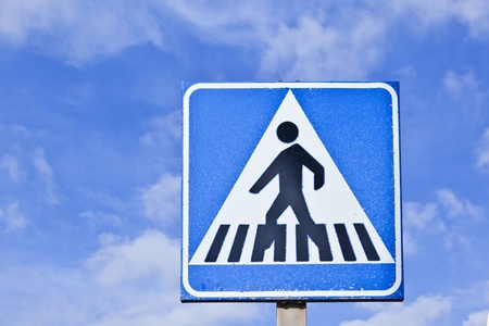 Pedestrian crossing traffic sign. Blue sign with a white triangle and a man crossing the street.