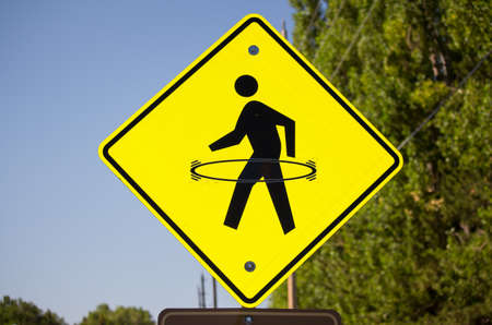 A bright yellow pedestrian crosswalk sign with a hula hoop drawn onto it.