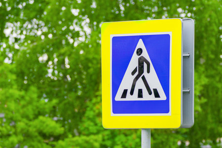 Bright pedestrian crossing sign in yellow and blue with a green leafy background, ensuring road safety