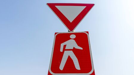 Pedestrian crossing blue sign with yellow light-reflecting frame. Blue sky background with copy space for text. Picture of person crossing the road. Road laws and highway regulations