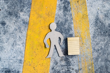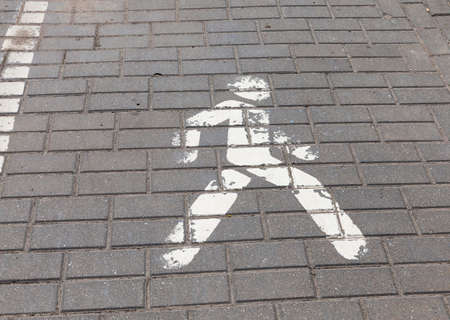 painted on an old tile man, determining where it is allowed to walk pedestrians, closeup