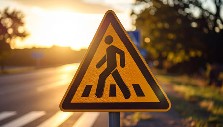 A bright yellow pedestrian crossing sign stands on the roadside during sunset. The sign alerts drivers to watch for pedestrians crossing the road, ensuring safety for all.