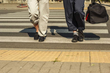 people crossing the road at a pedestrian crossing. leg closeup. outdoor on sunny summer day