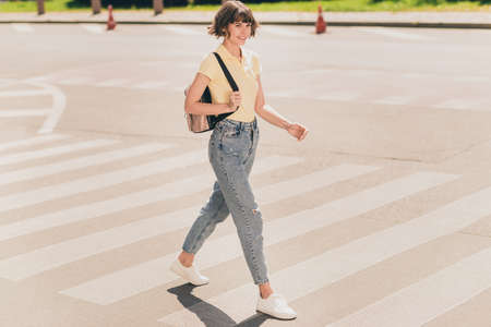Young woman crossing road. Concept of choice