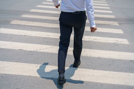 Back view of businessman crossing the street on crosswalk