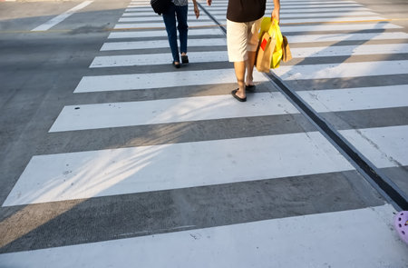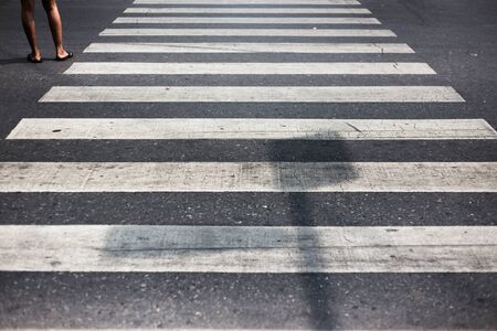 Pedestrian zebra with walking female legs and asphalt. Road crossing background, safe cross walk in city. Urban backdrop