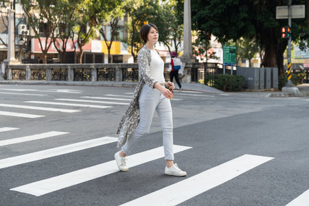 Asian man walking on street on crosswalk sign