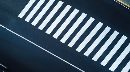 A stunning aerial photograph showcasing a pedestrian crosswalk with vibrant white stripes against the black asphalt, capturing the essence of urban design and infrastructure.