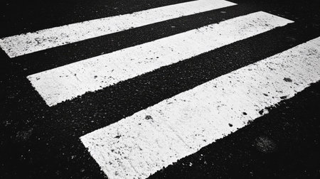 A high-contrast black and white image of painted pedestrian crosswalk stripes on dark asphalt, emphasizing urban infrastructure and safety features in a minimalist design. Ideal for themes related to transportation and city life.