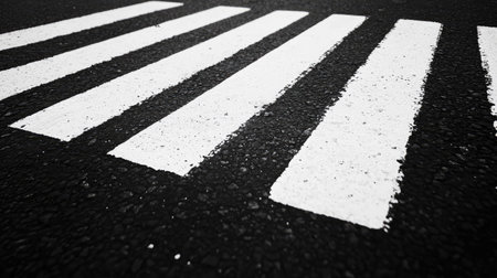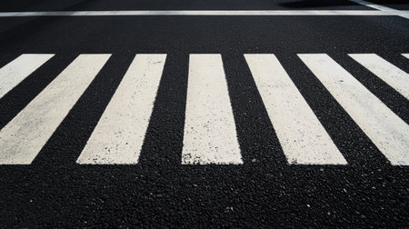 A close-up view of a pedestrian crossing with high-contrast white stripes on a black asphalt surface in an urban environment, highlighting safety in transportation.