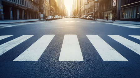 A captivating perspective of an urban crosswalk at sunrise, showcasing the smooth asphalt and tall buildings bathed in golden light, creating a tranquil atmosphere in the bustling city. Ideal for themes of urban living and architectural beauty.