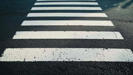 A close-up view of a pedestrian crosswalk showcasing white stripes against the dark asphalt surface, emphasizing urban design, safety, and pedestrian movement through city streets.