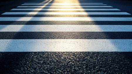 A close-up view of a zebra crossing on urban asphalt, illuminated by bright morning light, showcasing the interplay of shadows and lines for pedestrians.
