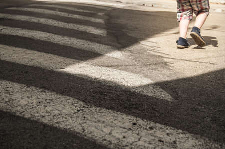 A close-up view of a pedestrian crossing highlighting shadows cast by early morning light. The urban street scene emphasizes safety markings and design elements.