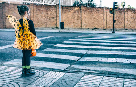 Little girl at stopped at zebra crossing in halloween costumes. She is walking towards children party site. Badajoz, Spain