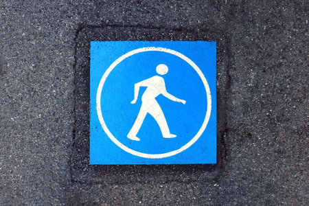 pedestrian blue warning sign on the road surface, walk sign blue color on footpath, symbol pedestrian walk at sidewalk floor, blue sign of pedestrian walk at pavement, pedestrian crossing blue