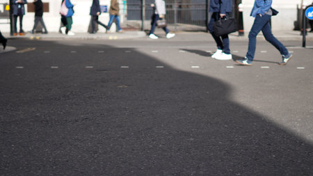 People walking across a white zebra crossing pedestrian road marking. Feet and legs with no faces and a copy space area.