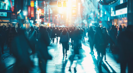 Crowd walking on a busy city street with a motion blur effect