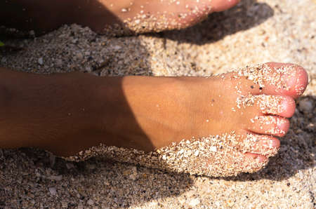 Three pairs of feet on the sand. Family vacations. Feet and grains of sand.