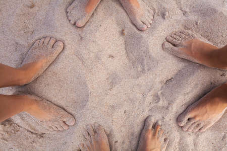 Family picture, all feet together on a beach with black sand. Top view of a group of people standing in a circle barefoot. Mother, father and sons enjoying summer holiday. Togetherness, unity concept