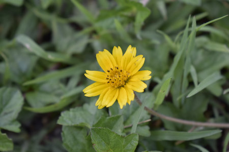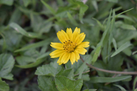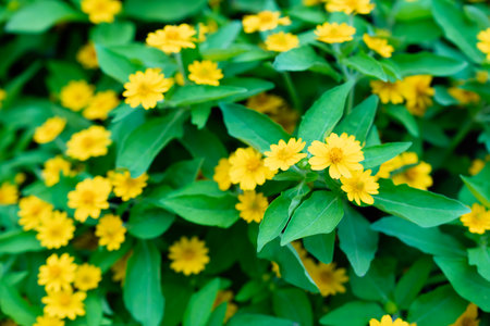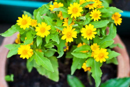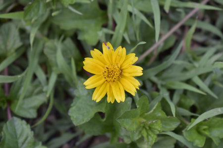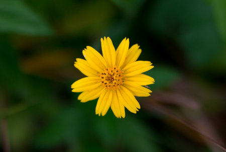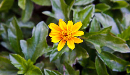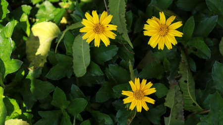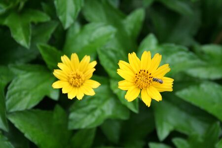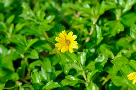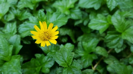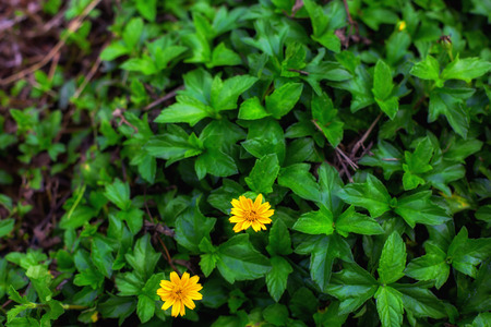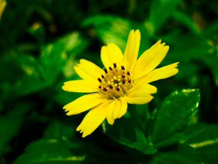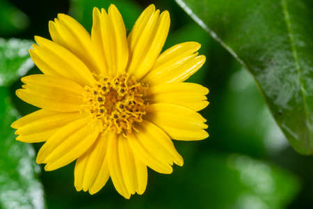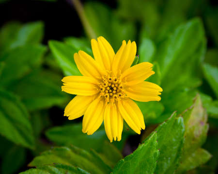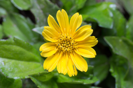 Little yellow Singapore daisy with green lush leaves background - top view flower shot