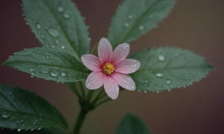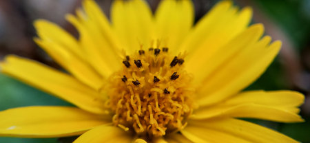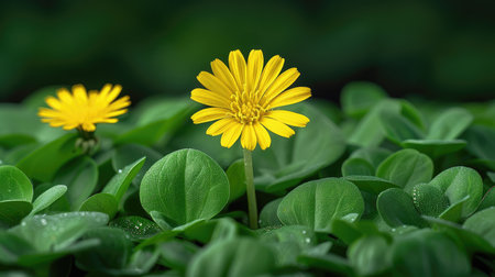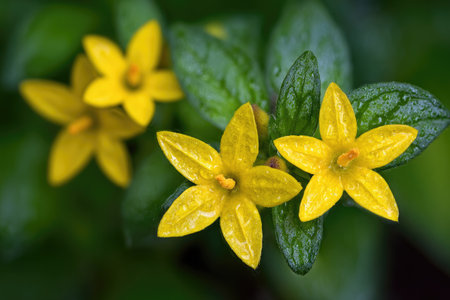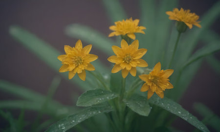 A macro shot of a yellow flower showing water droplets on the leaves. This herbaceous plant is a terrestrial plant that thrives on moisture, typical of annual flowering plants
